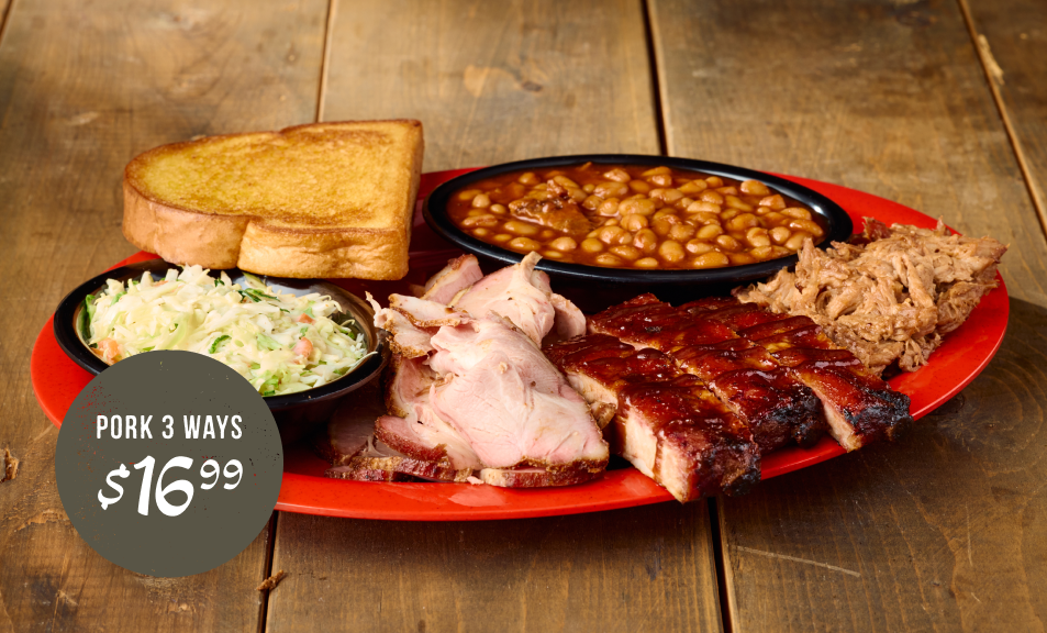 The Pork 3 Ways is loaded with Pulled Pork, Sliced Pork, and Sweet & Smokey Ribs—the meats that made us famous. Served with two sides and bread for $16.99, it’s the ultimate taste of Sonny’s BBQ tradition.