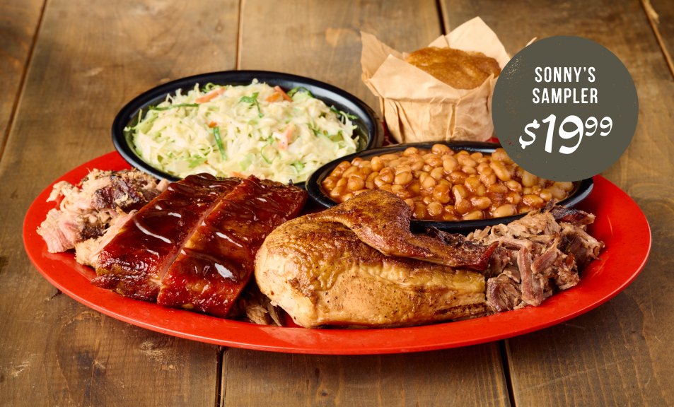 Can’t decide? You don’t have to. The Sonny’s Sampler serves up Pulled Pork, Chopped Brisket, Sweet & Smokey Ribs, and ¼ BBQ Chicken—all on one plate. Complete your feast with two sides and bread for just $19.99.